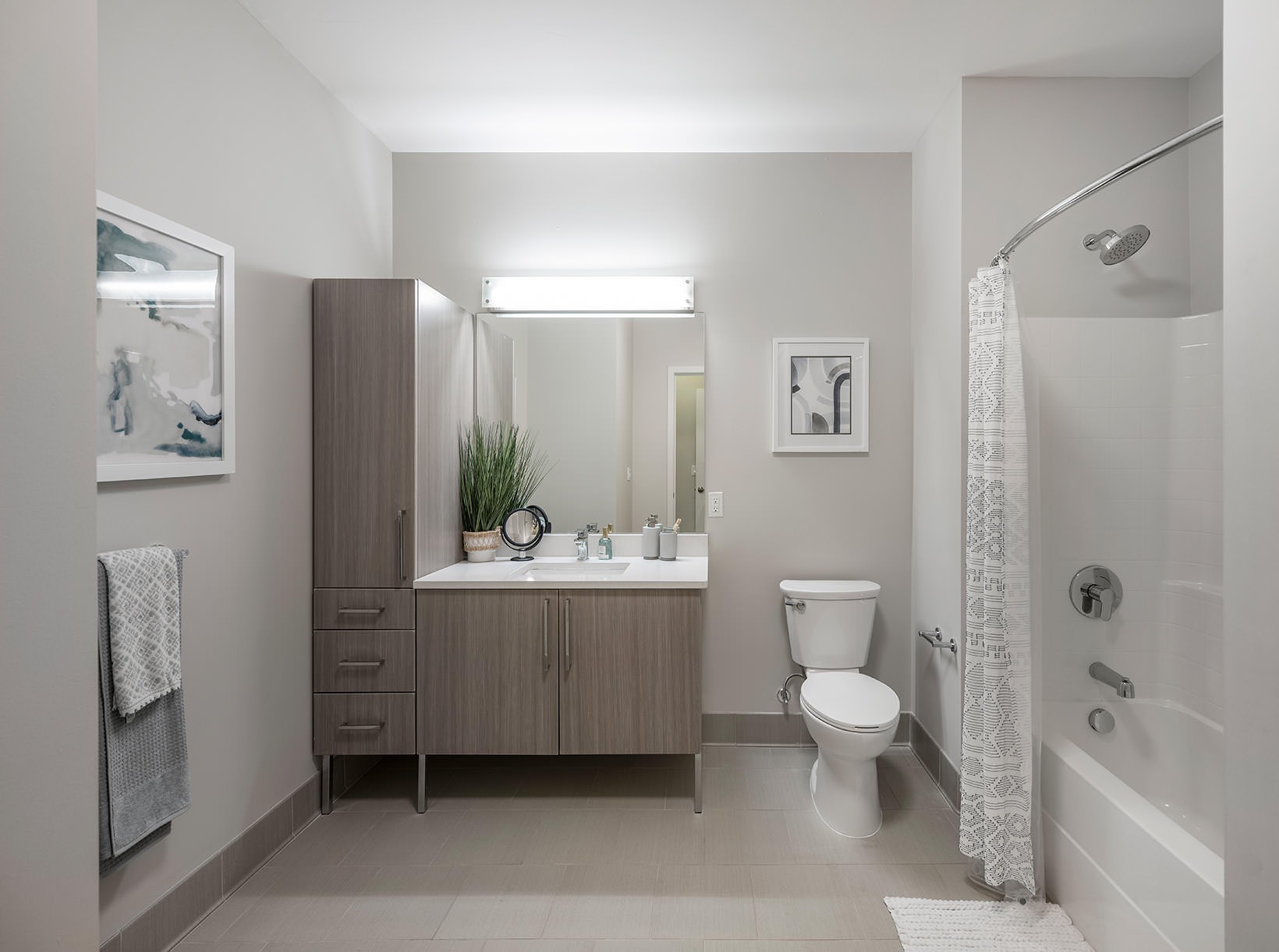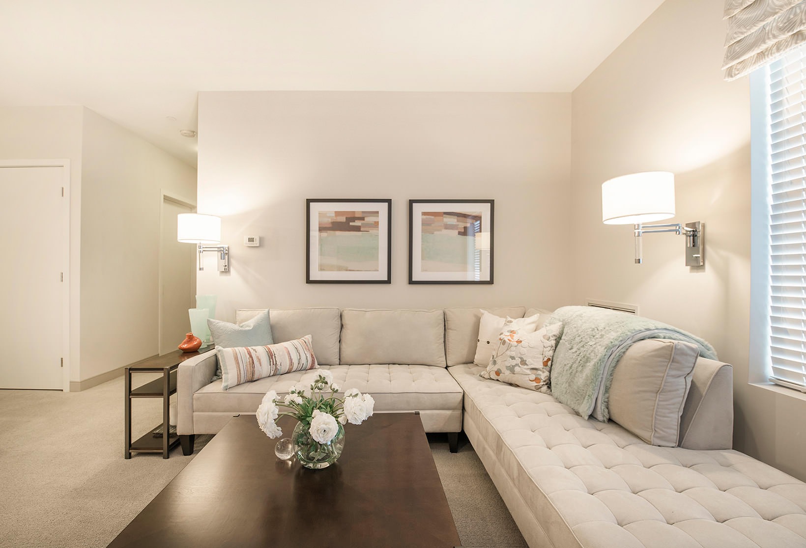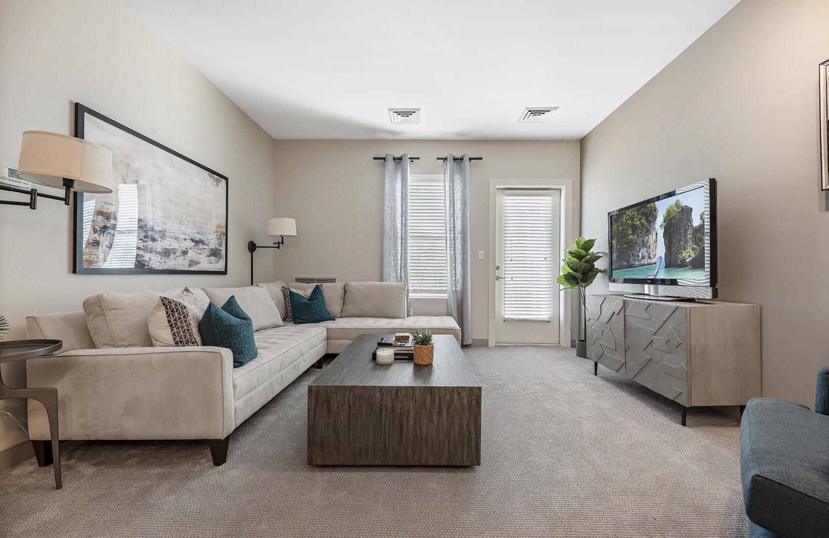 bright and spacious living room kitchen with island open to living room carpeted bedroom with large windows shower/tub combo in bright bathroom well lit living room bedroom dresser and mirro