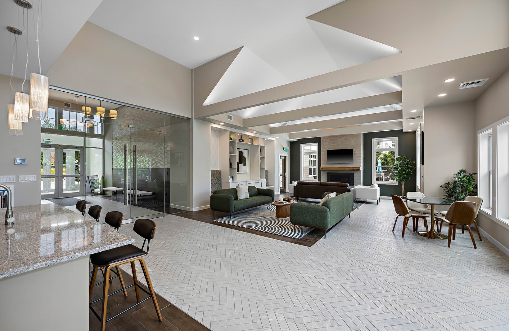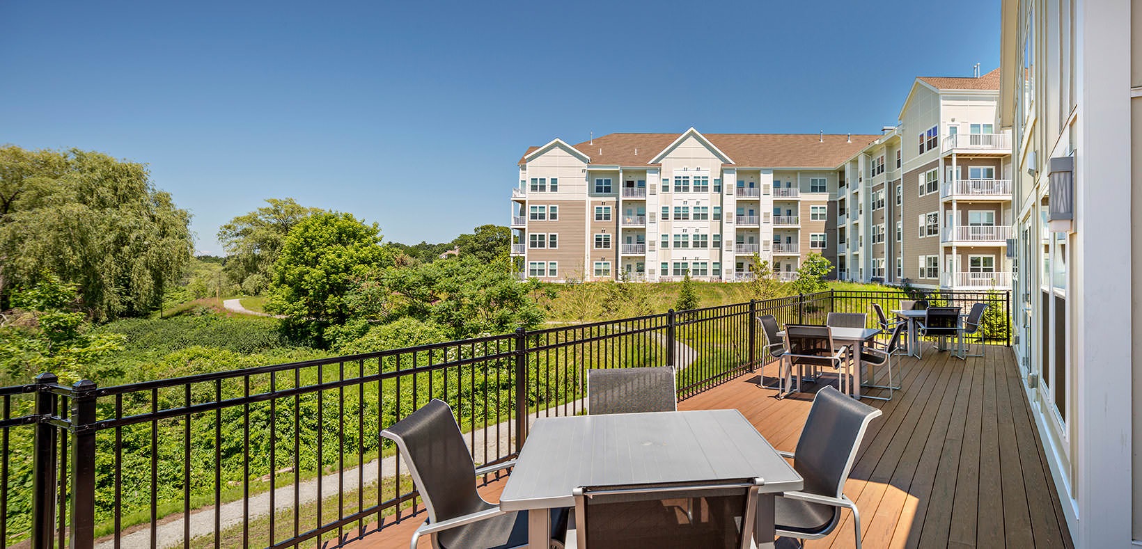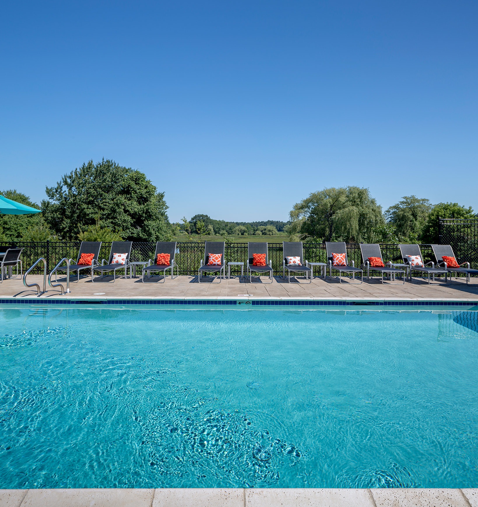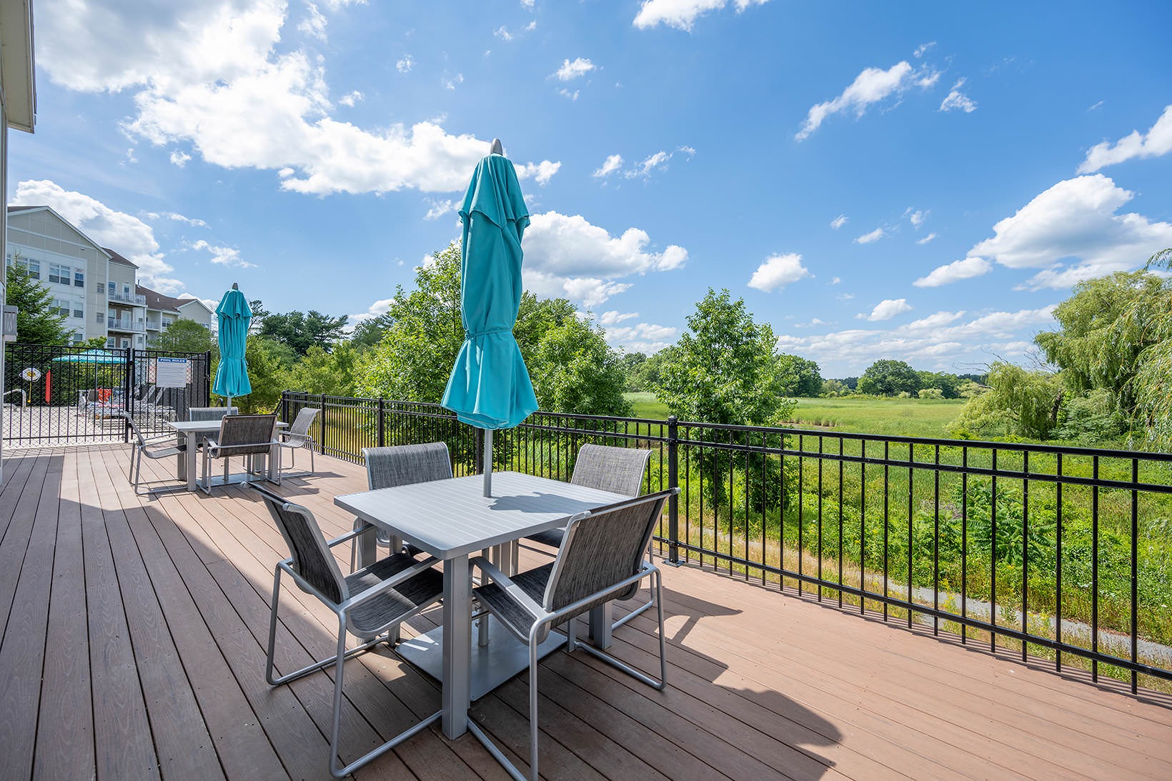 spacious clubhouse with kitchen Patio looking out to a green meadow. Table and chairs with a large blue umbrella Gym with treadmills, elliptical machine and weight machines a room with couches and a tv a room with couches and a tv a room with a conference table and chairs large, outdoor pool clubhouse deck with green belt views a demonstration kitchen with a table and chairs